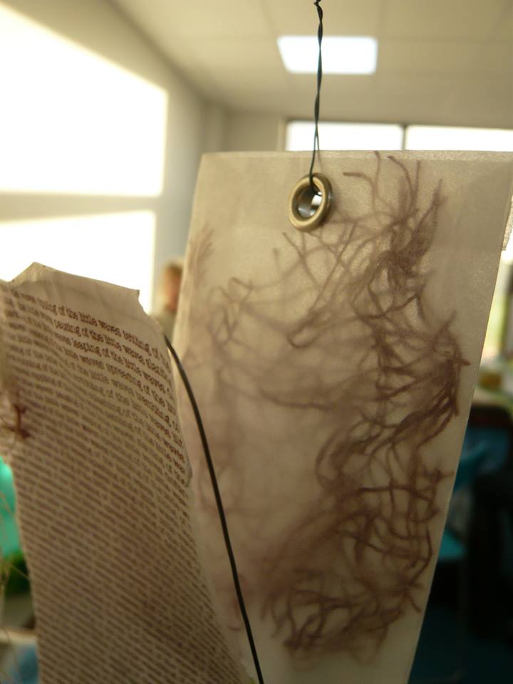 Our studio welcomed artist, illustrator and educator Brigid Collins on Saturday 12th November to lead her Making a ‘Book-Object’ workshop. I took part and enjoyed her processes, particularly her concept of ‘poem houses’ – making structures with wire and tissue paper, making them robust with shellac varnish, and creating an intimate space for the poems. She then works with text and found objects to add insertions which add suggestion and resonance. I immediately saw that I could express something about fragility and strength with the medium, about interior and exterior, and with things seen and unseen. I wanted to create a mobile from several of these objects. I think its going to be part of a larger body of work, a project based on lived experience and memory. I’ll write a bit more about this in a future posts…