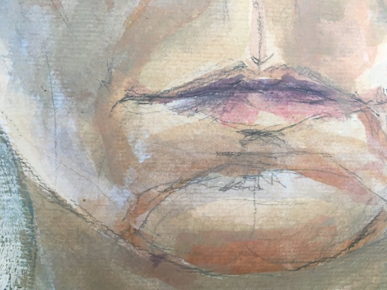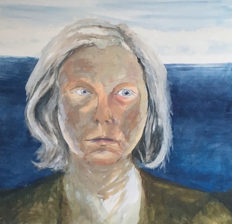 The beginnings of a new self-portrait. I had a photograph I took the day before the accident last July, which has a layer of fluffy white clouds on the horizon. I’ve placed myself, as I am now with my damaged eyes, in front of the landscape from then. My hair is the same colour as the clouds, and my eyes are at the level in the sea where it happened. This place always draws me to look at it when I am close to the sea. I’m not totally sure how I will develop this further, but this is the start.