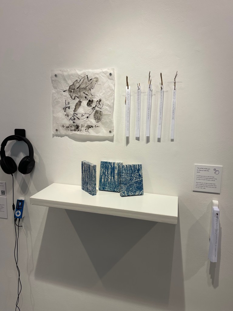 Ink drawing on tracing paper, walking score notes on twigs, cyanotype woodland objects, sound recording of each artist reading their walking score for each other, backgrounded by walking sounds, interactive walking score notes for visitors to take home and use on their next walk.