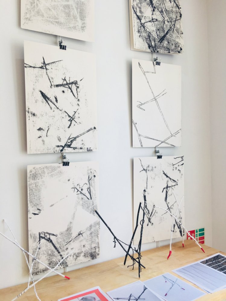 I took photographs of the twigs in a variety of environments, and of the ghost vessels in ways which revealed the unexpected inner life I had noticed. I explored the twigs’ shapes by drawing and printing them, going back and forth between presence and absence. The images were reminiscent of the empty tube shapes of the opthalmologists’ images. Lastly I overlaid the ghost vessels I had drawn with scraps of paper and printed them again, creating blank spaces, evoking sight loss.