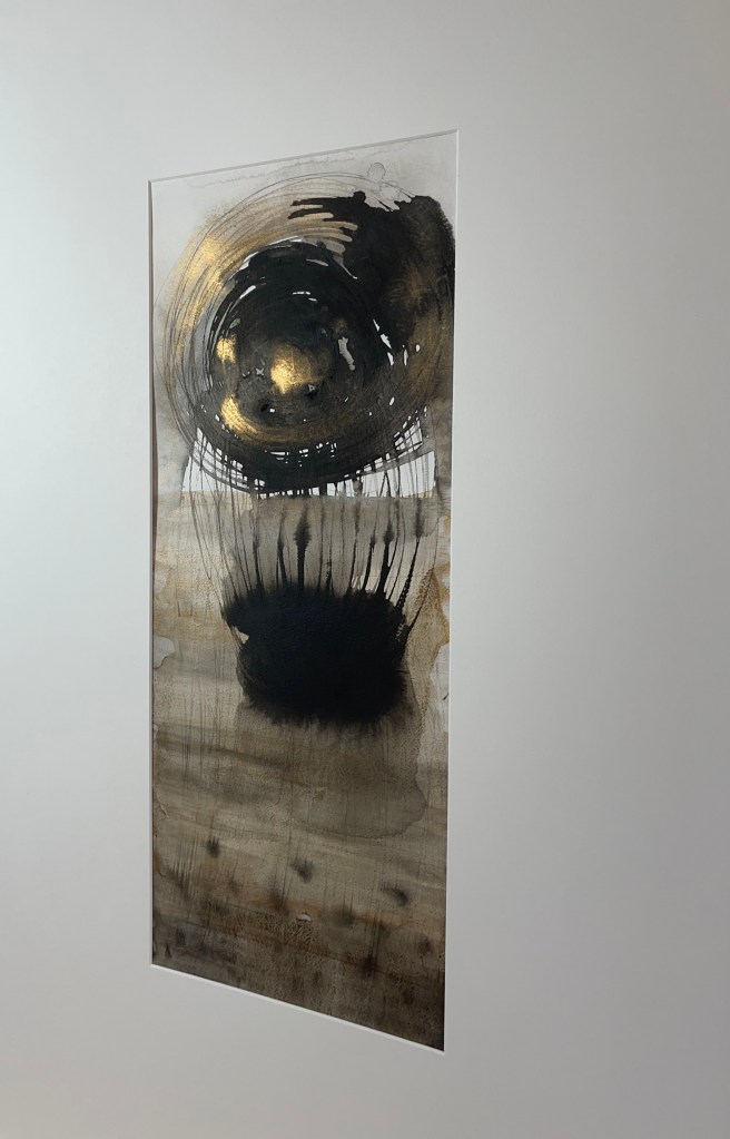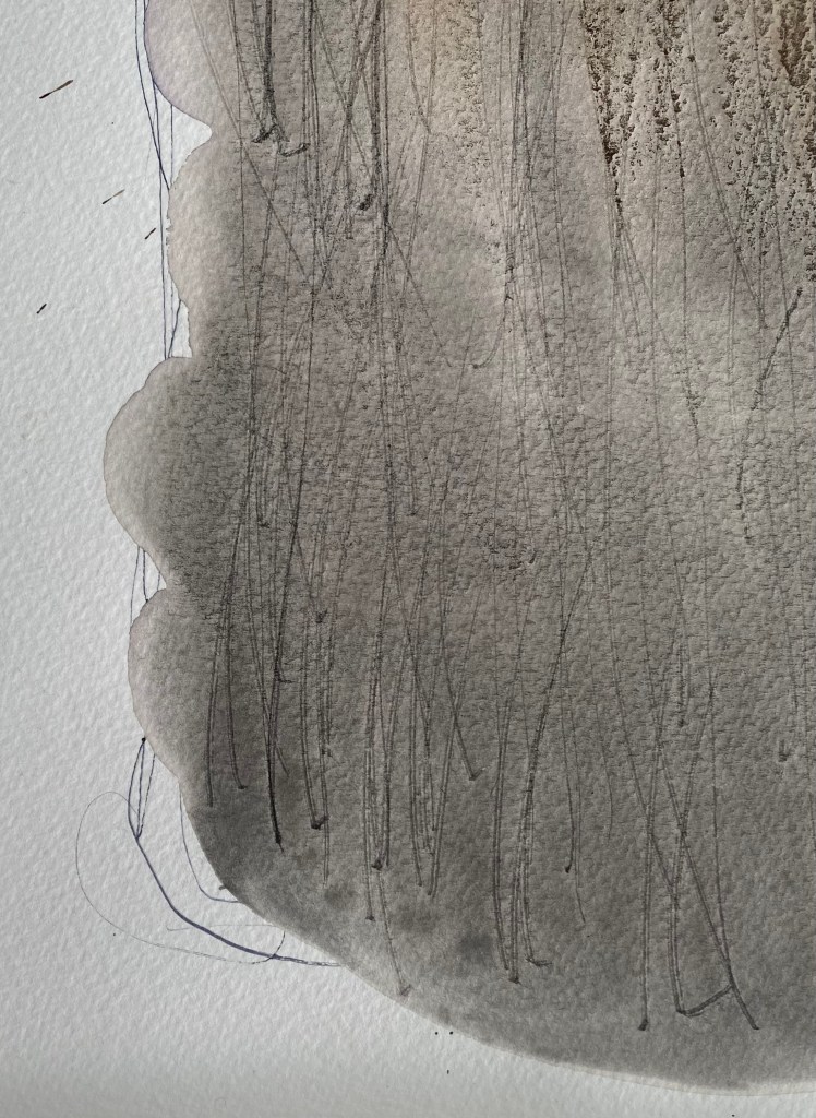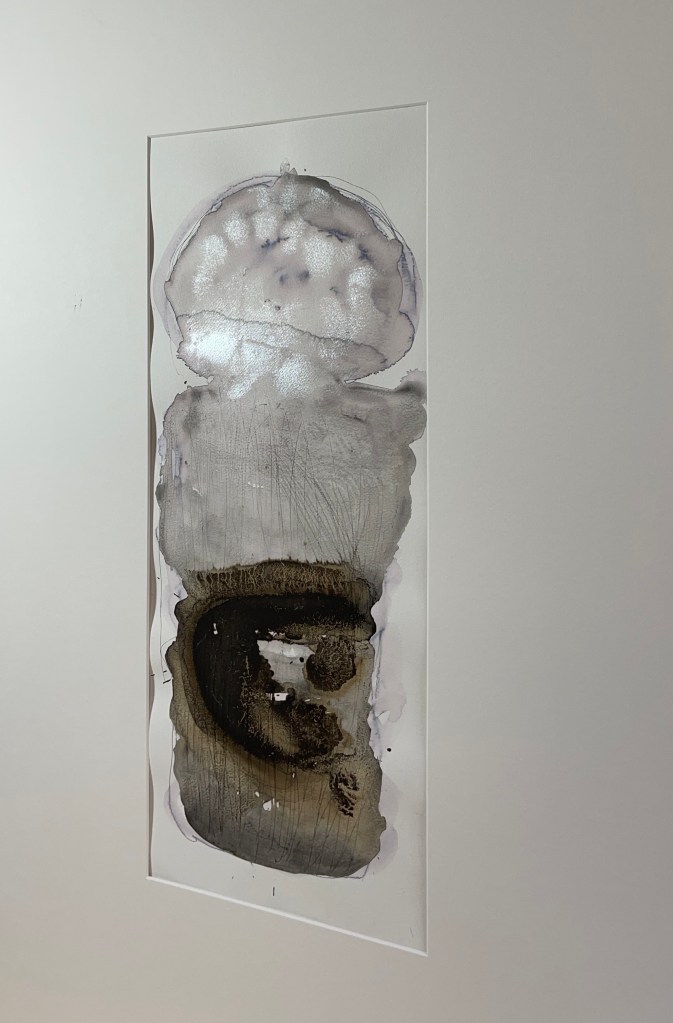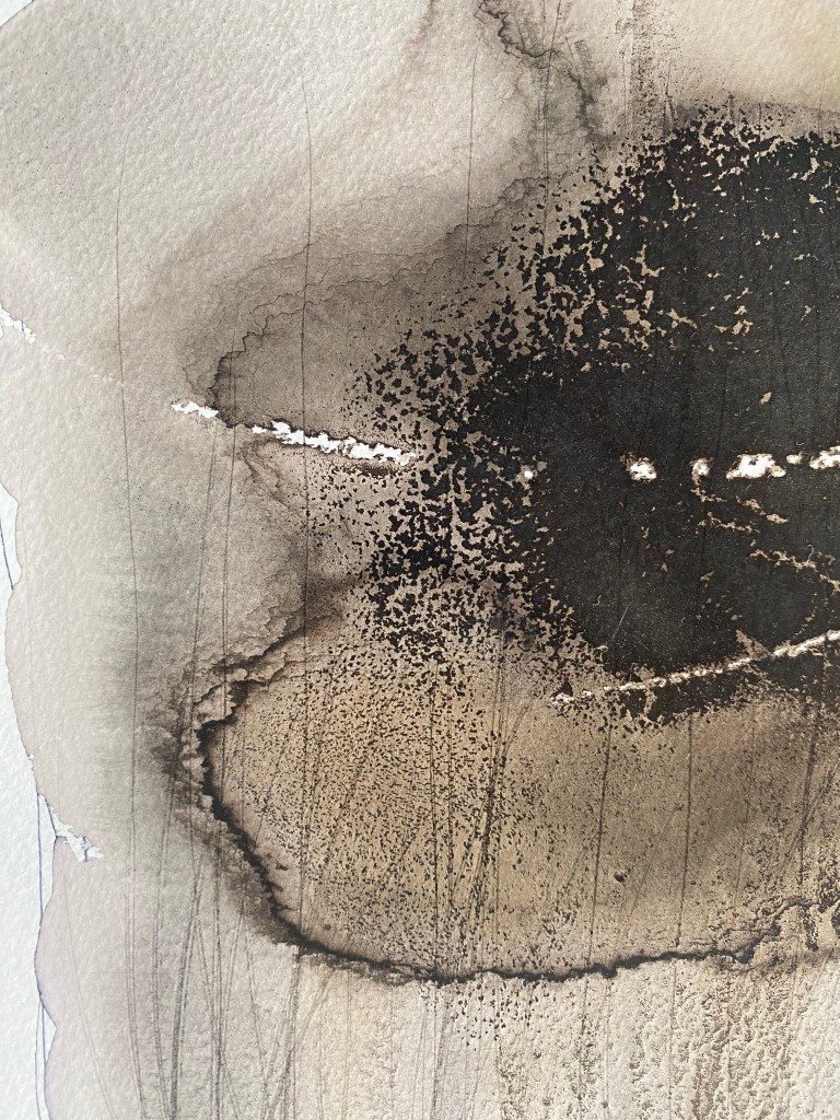 I used several mediums, including handmade inks created from foraged botanic materials, commercial and handmade watercolours and inks, as well as pen, charcoal, fabric and text. Water-based materials allowed for ‘flooding’ and unexpected and self-resolved effects, and allowed me to develop techniques of ‘letting go’ while also making constant decisions.
